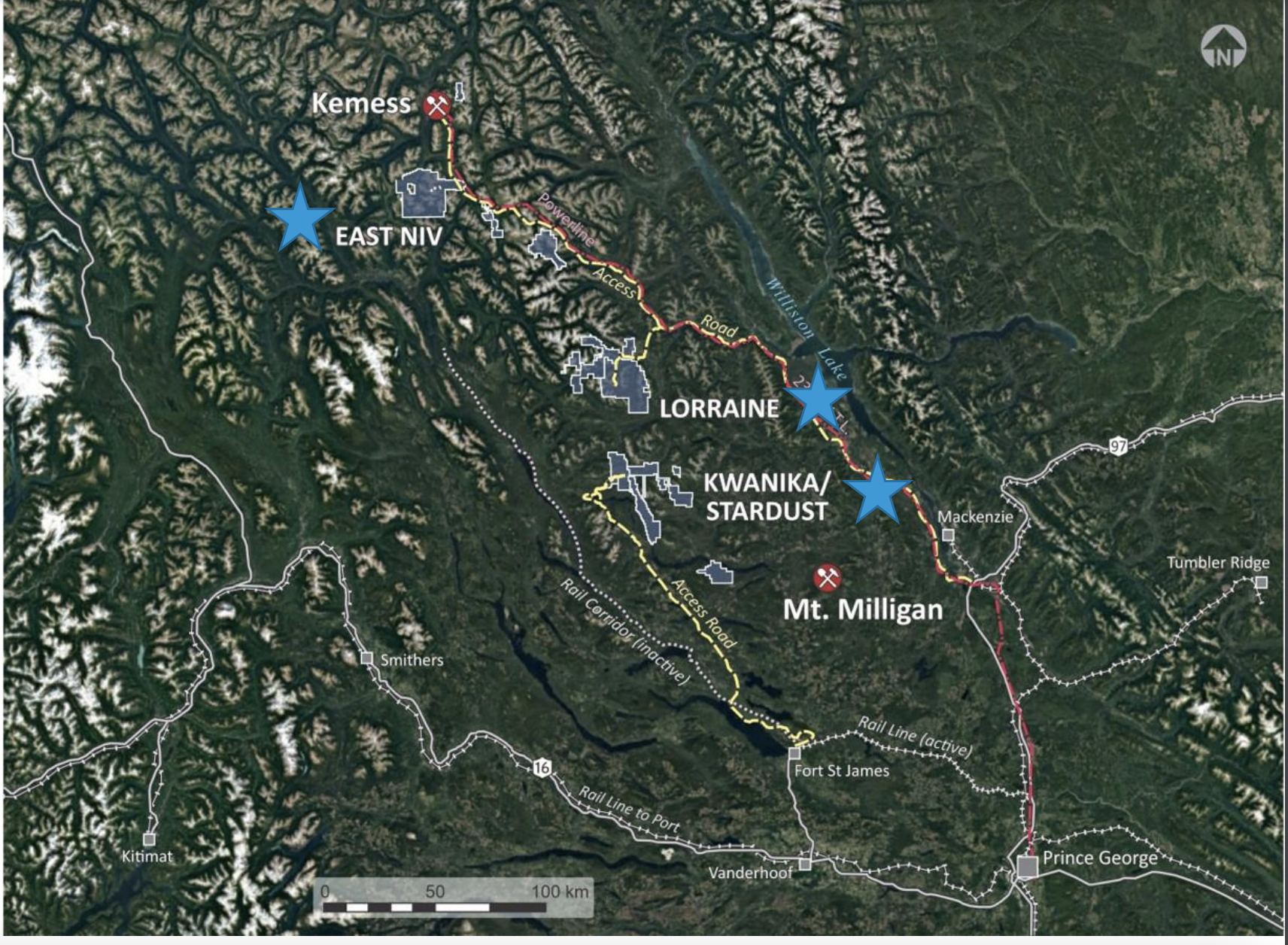 NorthWest Copper's land position of >175,000 hectares is 100% owned by NorthWest Copper, and occupies highly prospective ground between the longlife Mt. Milligan Mine and the Kemess Project. East Niv, Arjay and Kwanika- Stardust have no royalties. |