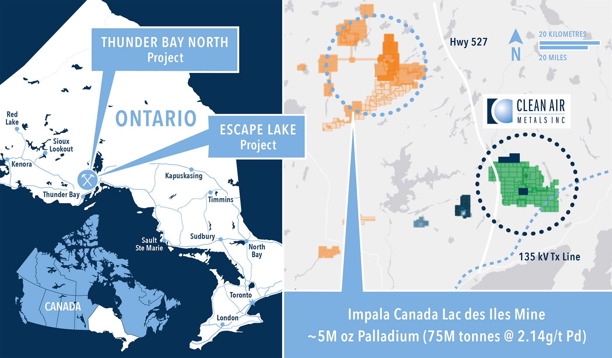 Clean Air Metals' flagship asset is the 100% owned, high grade Thunder Bay North Project, a platinum, palladium, copper, nickel project located near the City of Thunder Bay, Ontario and the Lac des Iles Mine owned by Impala Platinum. The Thunder Bay North Project contains twin magma conduit bodies hosting the Current and Escape deposits, forming the basis for a positive preliminary economic assessment (PEA) around a ramp access underground mine, effective December 1, 2021.